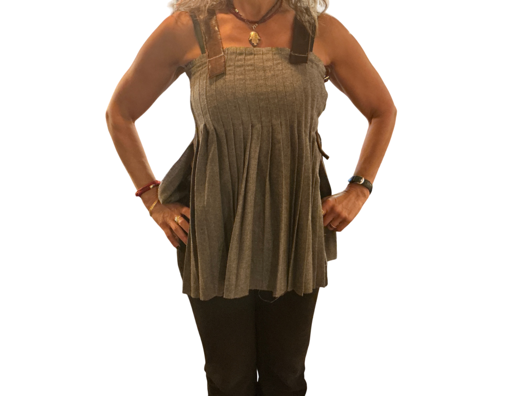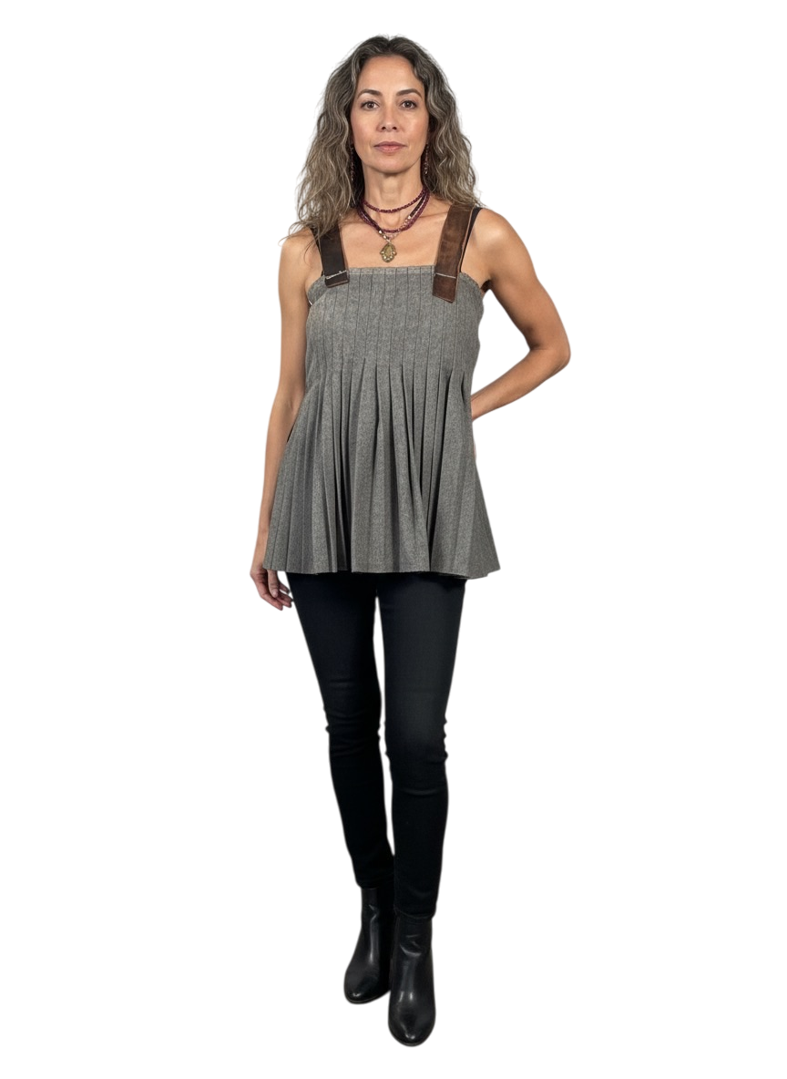 A chic grey knit shirt featuring a sleeveless design with pleated detailing. The wide straps add a bold statement, while the zipper detail on the side brings a modern touch. Perfect for casual outings or layered looks, this piece combines comfort with a fashionable edge.