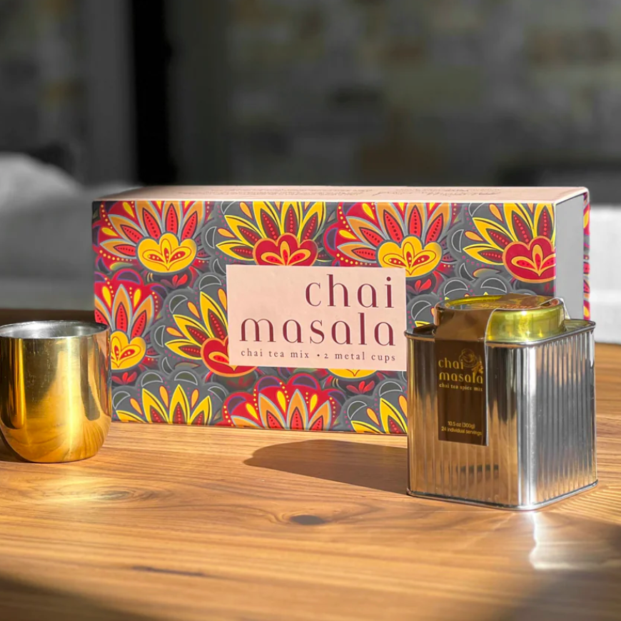 Gift set includes decorative gift box, stainless steel tin with 24 servings of Chai Masala Mix, and two stainless steel, double walled drinking mugs. All items Made in India.