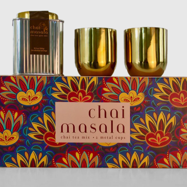 Our Chai Masala Tea Gift Set is more than just tea; it's a complete chai experience. Inside the beautifully decorated metal tin, you'll find our exquisite Chai Masala Tea blend, along with two brass-colored, double-wallΒ  drinking mugs that exude an aura of sophistication.