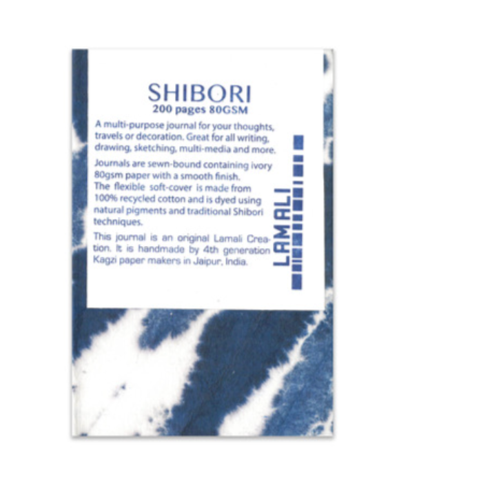 What sets these journals apart is their flexible cover, crafted from 100% recycled cotton and dyed using eco-friendly pigments and traditional Shibori techniques. Shibori journals are assembled and bound by 4th generation Kagzi papermakers in Jaipur, India, so each journal is unique.