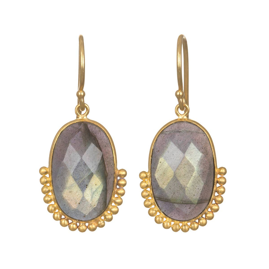 Shine a light on your truth so it may illuminate your path. Oblong labradorite earrings—stone of imagination, perseverance and truth— are dotted with gleaming 18kt gold plate beads along the bottom for an eye-catching accessory.