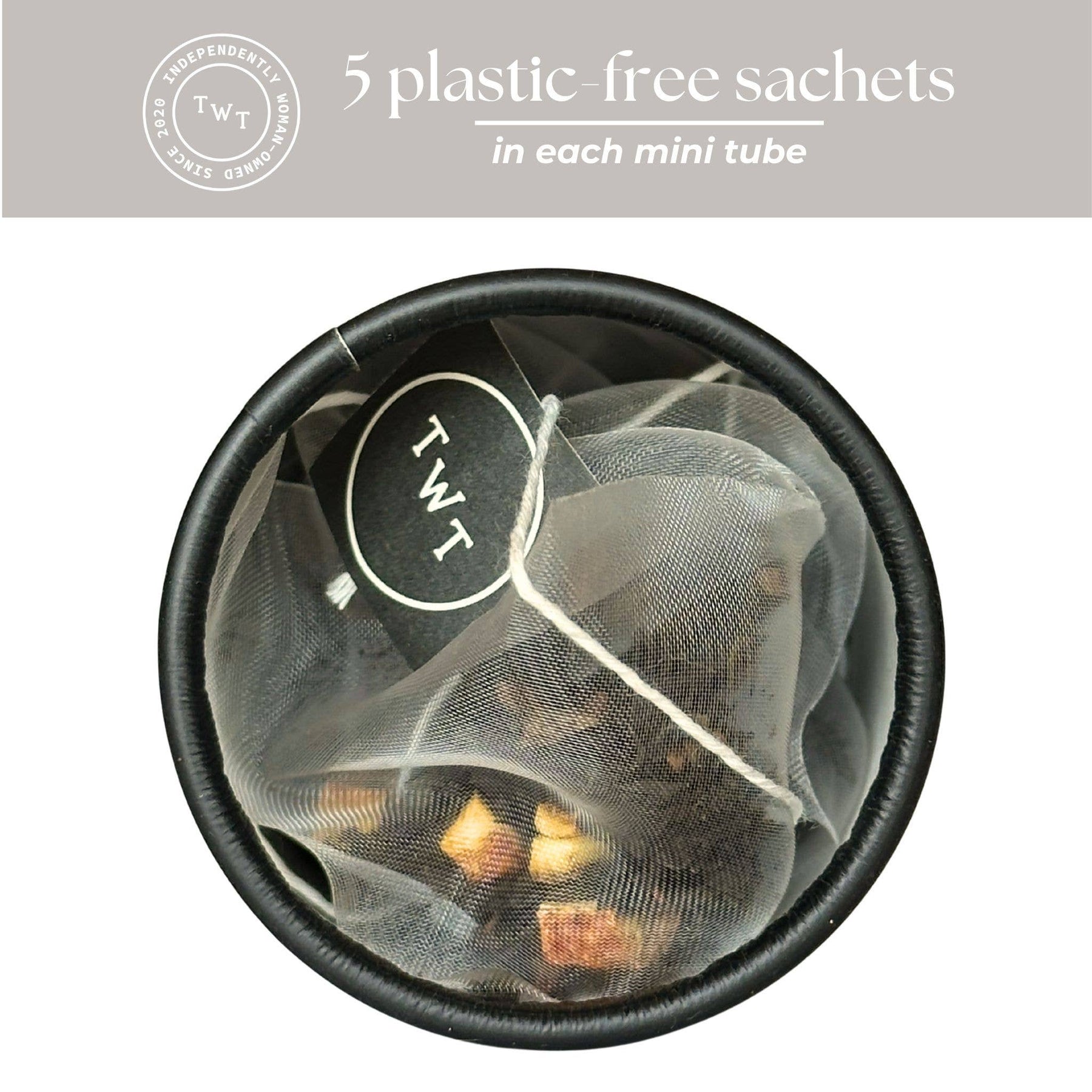 The perfect small gift for any occasion under $10. Each mini tea tube is 2” wide and 3.5” tall and is made from 100% recyclable rigid paper tube material. Inside are 5 pyramid tea bags that are made from premium, plastic-free, biodegradable material. Each tea bag holds approximately 2-2.5 grams of whole-leaf tea and herbs. Most customers get at least 2-3 steepings out of each bag. RUDOLPH'S DELIGHT: Our take on a hot cinnamon spice blend made with lots of black tea, cinnamon, and orange peel. This is the tea that keeps Rudolph guiding Santa's sleigh around the world all through the night! Our mini tea tubes are perfect small gifts for holidays, Christmas, Black Friday, travel, stocking stuffers, checkout line, grab-and-go options, gift baskets, small tokens of appreciation, Father's Day, back-to-school, teacher gifts, weddings, birthdays, boutique retail shelves, and more.