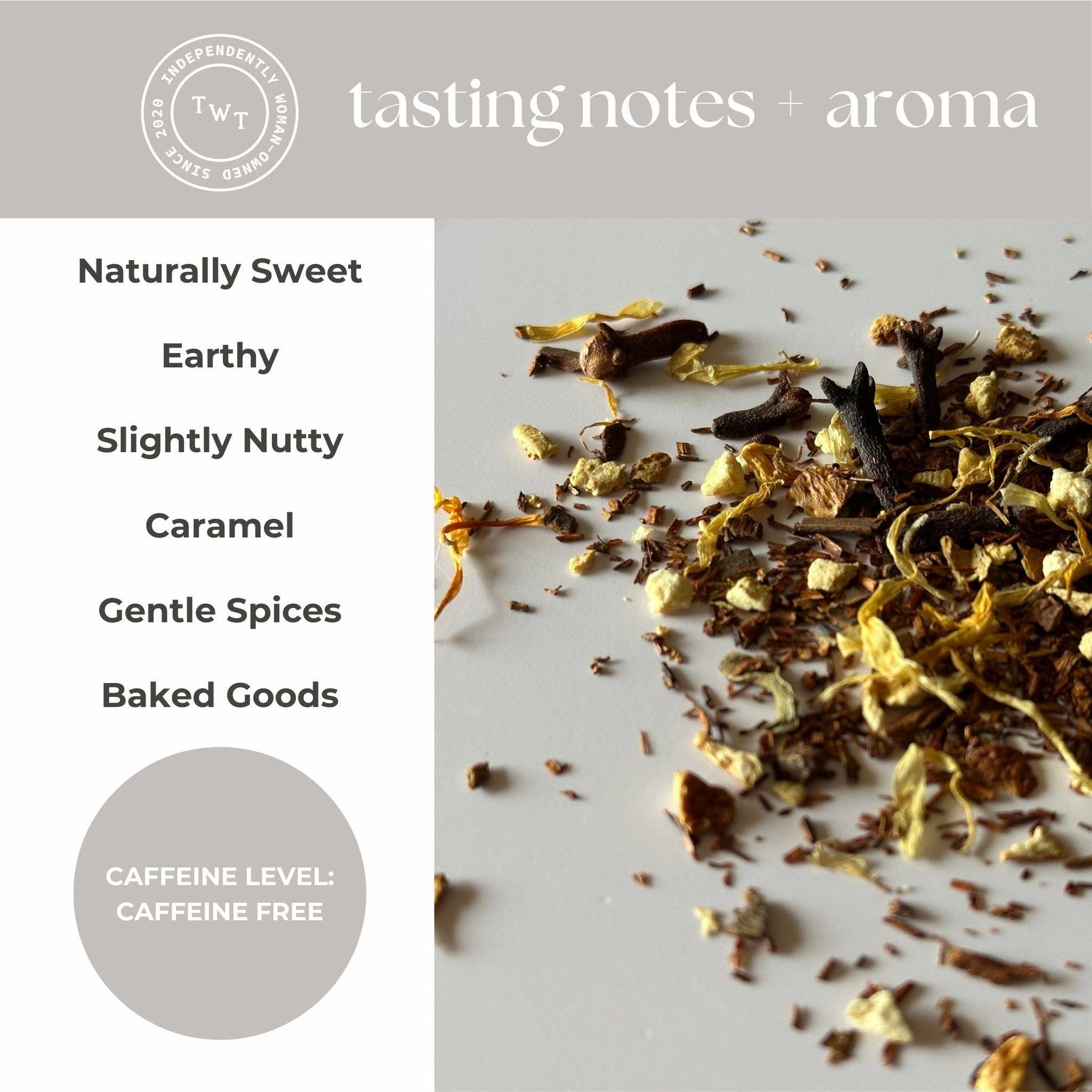BAKESHOP BLISS (CAFFEINE-FREE): Step inside our Christmas bakery and enjoy this cozy caffeine-free mix of spices, marigold petals, orange peel, vanilla, and rooibos.