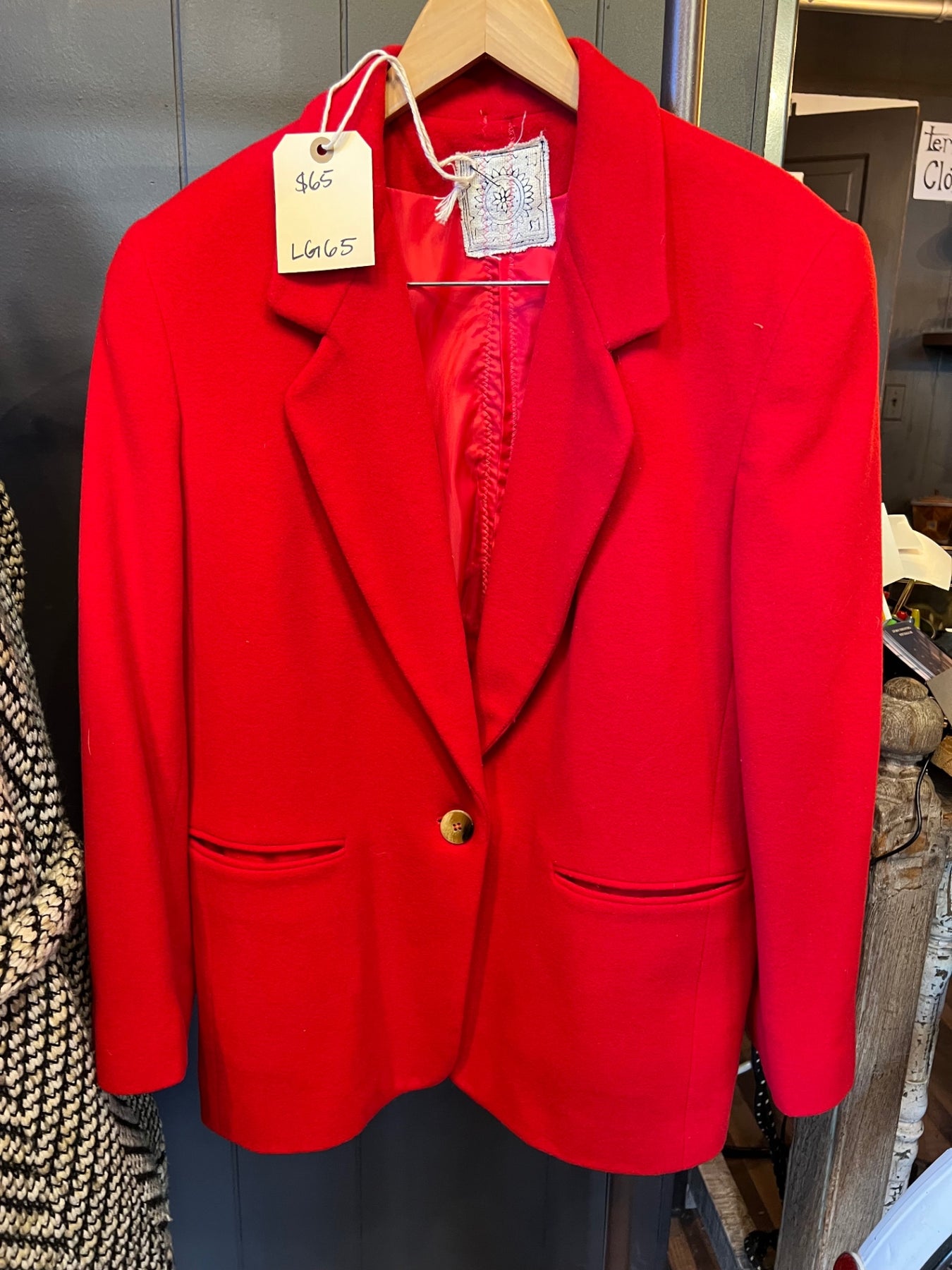 This vintage red blazer is crafted from 100% wool.