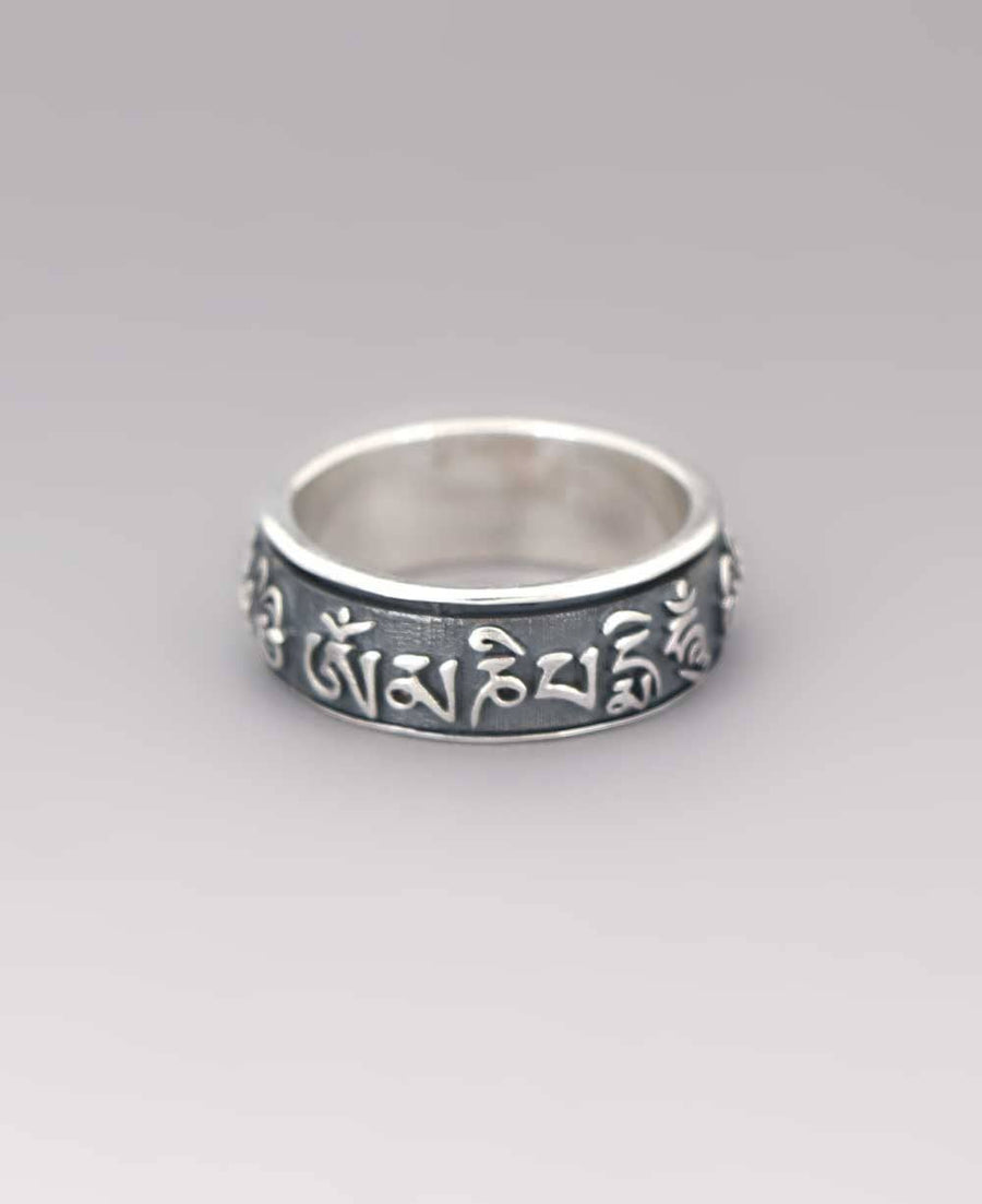 * Spinning mantra ring * Features a traditional Tibetan mantra * Made of sterling silver (925 stamp) * The ring's band is about 0.25 inches wide * Available in sizes 6-13